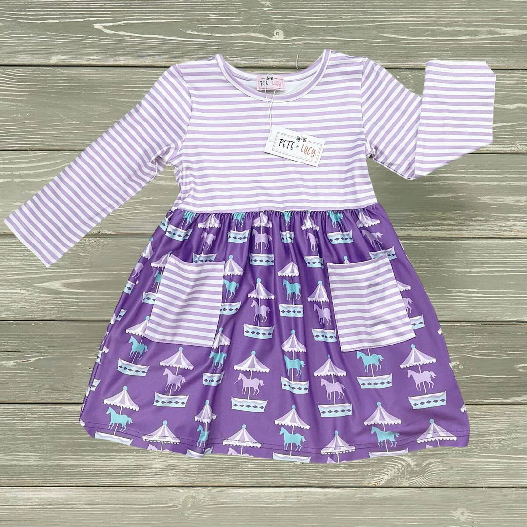 Step right up for twirls, giggles, and carousel magic! The Carousel Cutie Dress is a showstopper with its sweet striped purple and white top and a flowy solid purple skirt adorned with the most adorable carousel horse print. It's a dreamy mix of whimsy and classic charm—made for little ones who love to stand out.